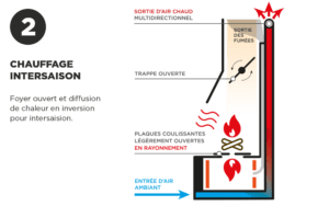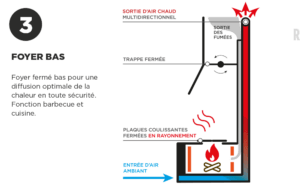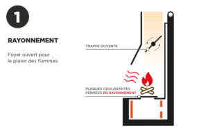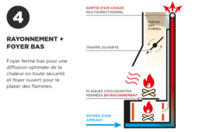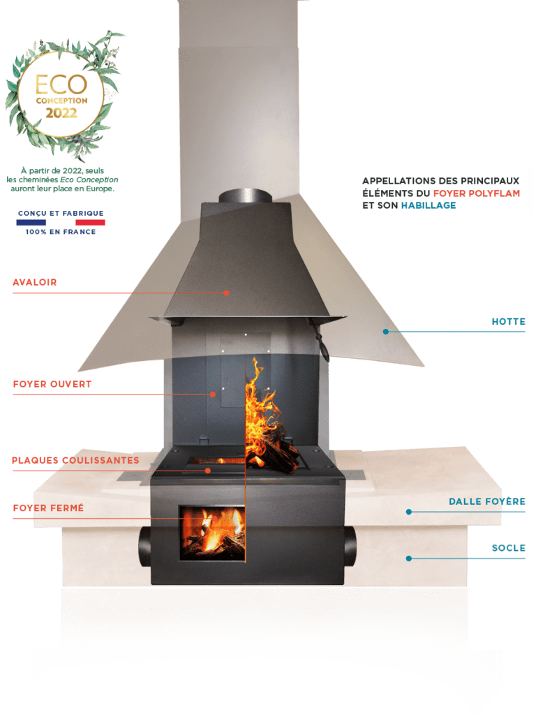 Les foyers Polyflam sont composés de deux foyers. Un premier foyer ouvert compose la partie haute de la cheminée. le second foyer se situe sous la plaque foyère, il peut être utilisé plaque fermée pour une diffusion optimale en toute sécurité de la chaleur. Il peut être également utilisé en même temps que le foyer ouvert.
